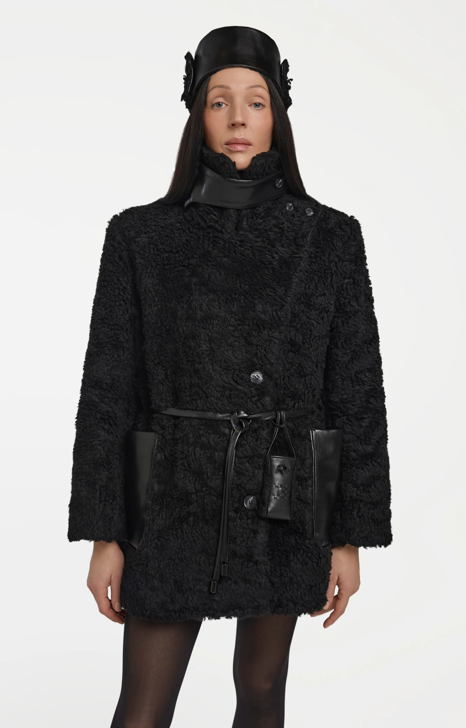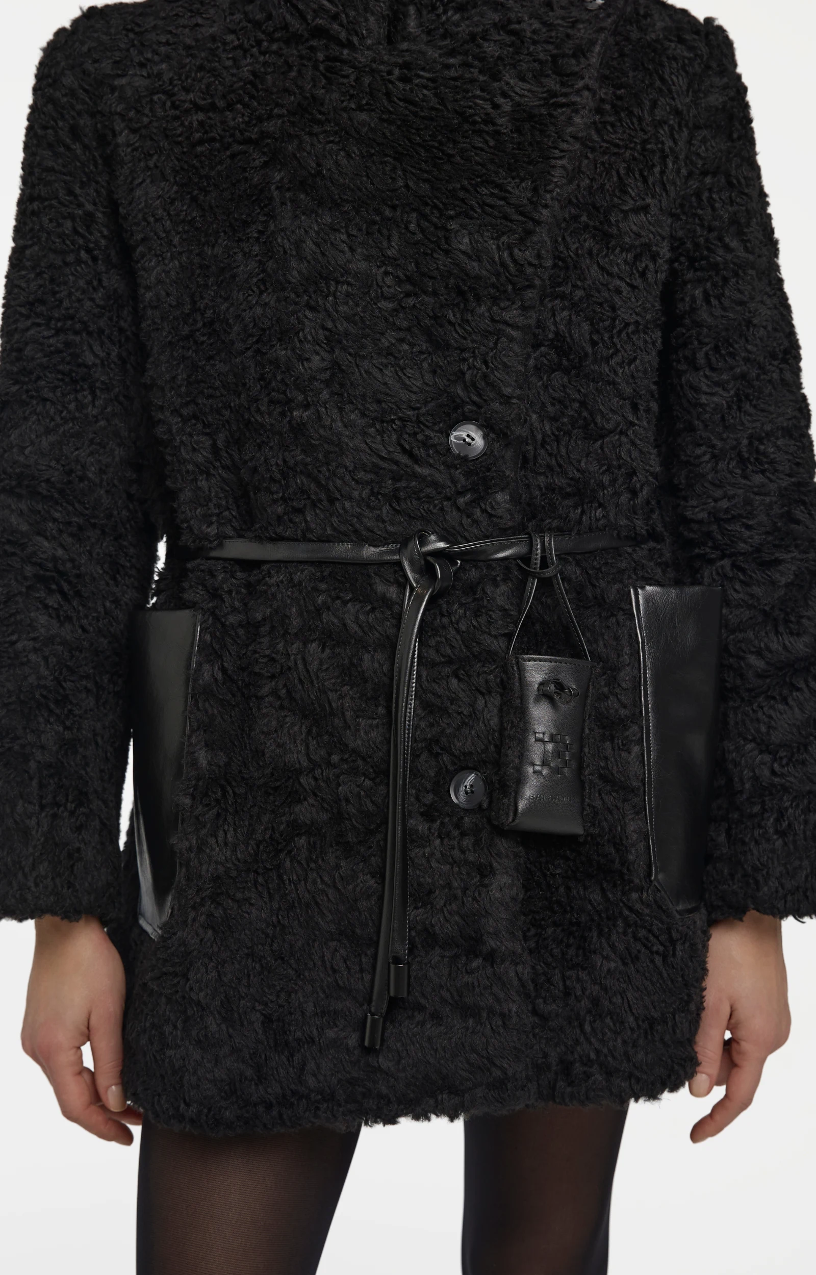 Cut from soft, supple plant-based leather derived from olive waste and flax-origin fur, featuring woven Balsais signature letter.