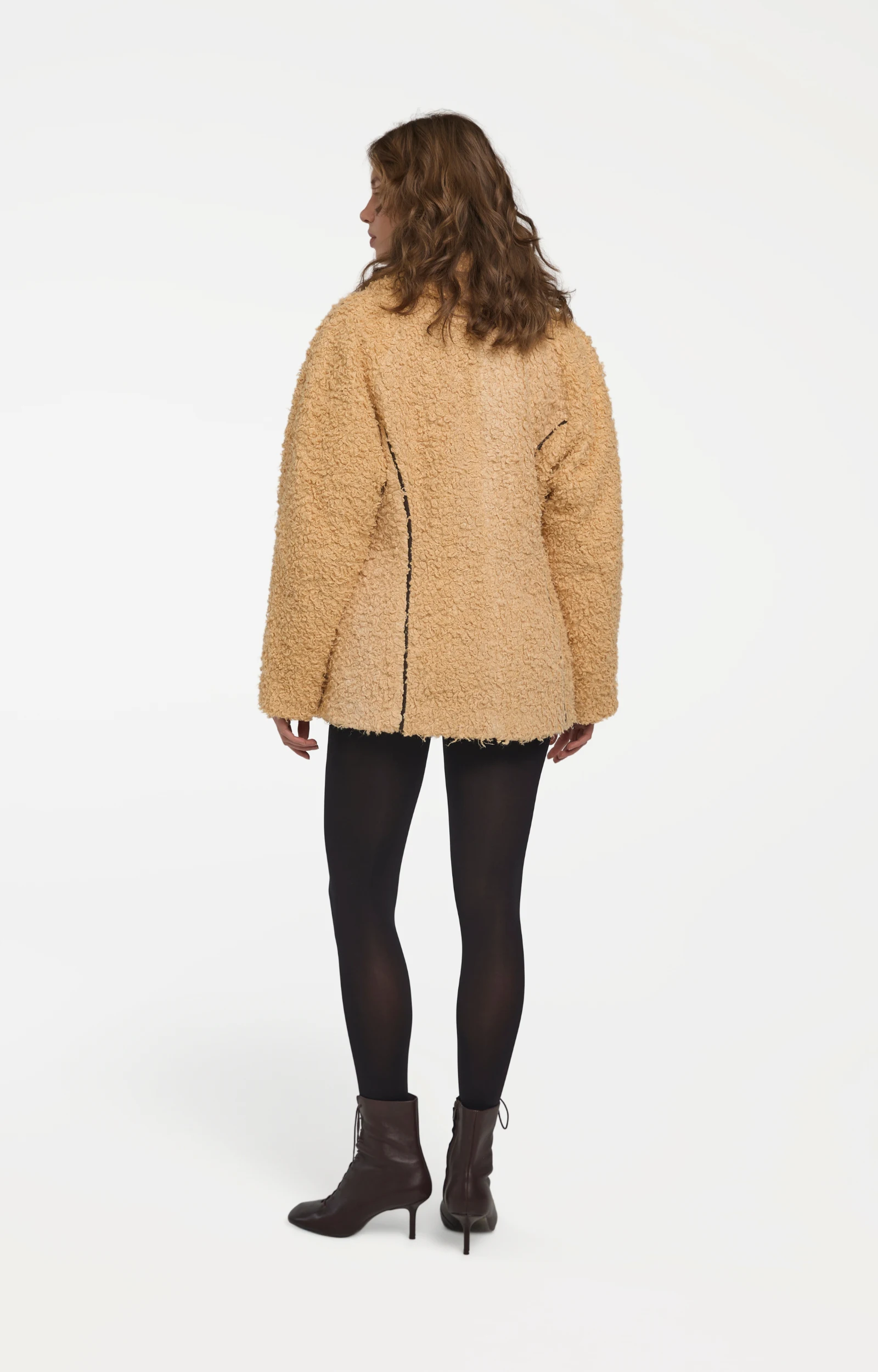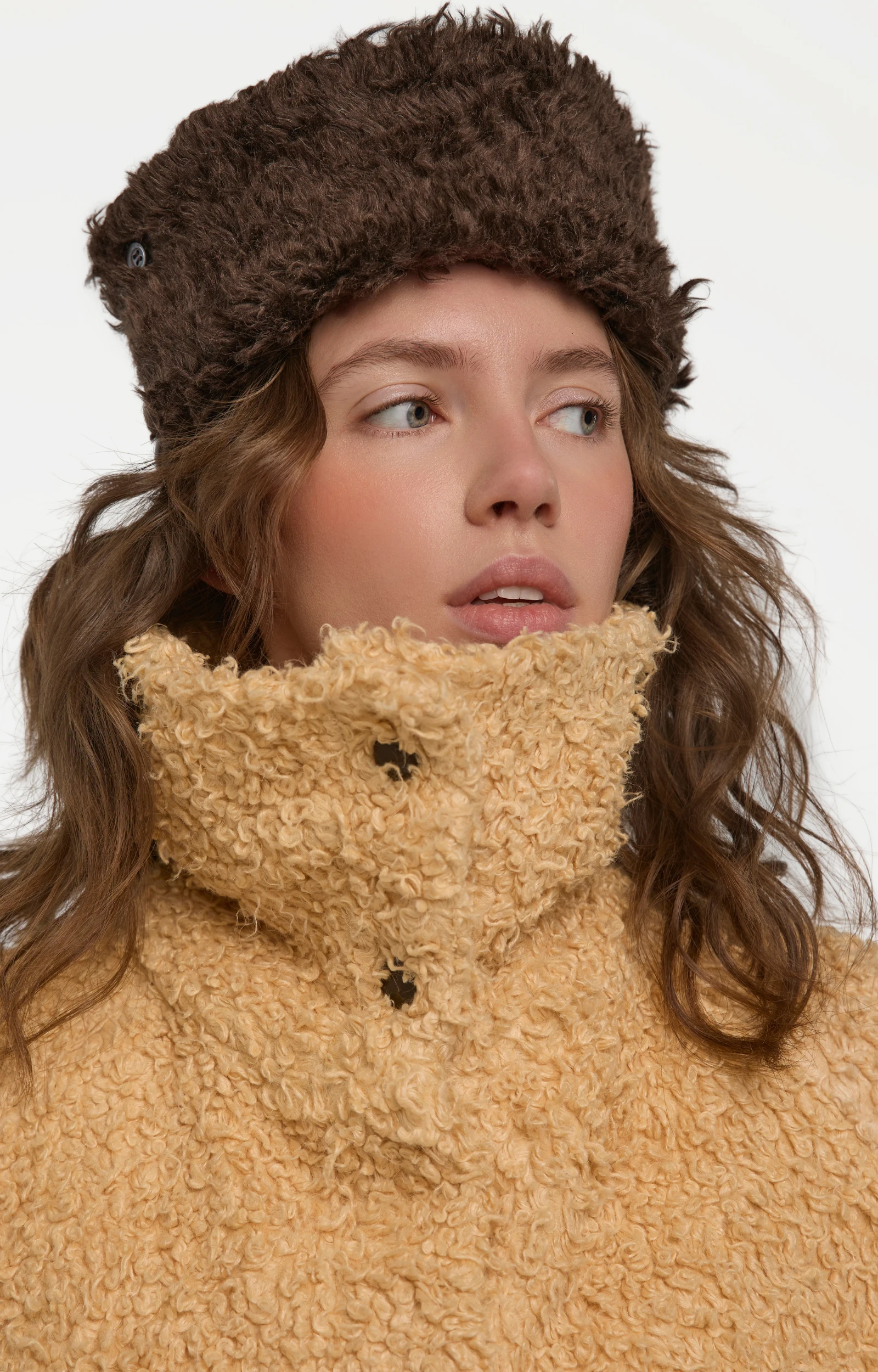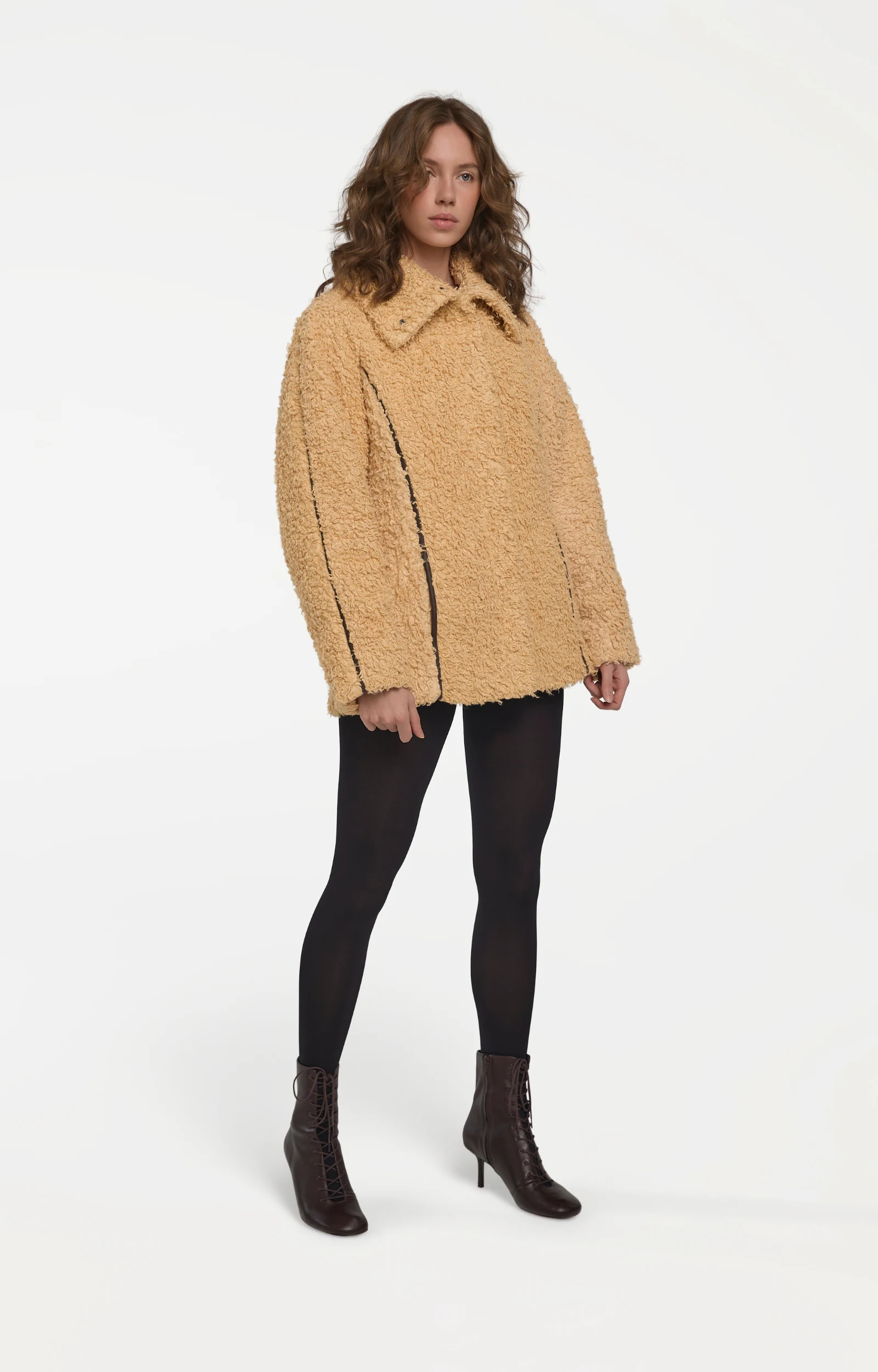 The form came first: sculpted, poised, with an undercurrent of playfulness. Then it became clear—it could only be adorned with the tender, buttery curls. Where Wolfie commands with mystery and force, Pecora lingers in subtlety, shaping the body with fluid precision and daring, unexpected sleeves. Together, they are a study in contrasts—a predator and its prey, opposing yet intertwined, an eternal tension made tangible.
